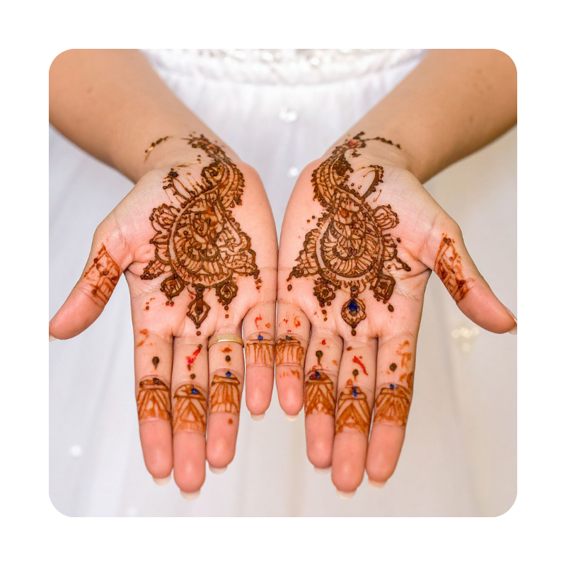 Experience the timeless art of Traditional Hand Henna with our beautiful cultural designs. Perfect for festivals like Eid, Diwali, Karwa Chauth, or any celebration, our artists create authentic patterns inspired by Indian, Arabic, and Pakistani traditions. From elegant Arabic trails to intricate Indian mandala designs, we offer a variety of styles to suit your preference. Our natural henna paste ensures a deep, rich stain that develops beautifully over 24-48 hours.